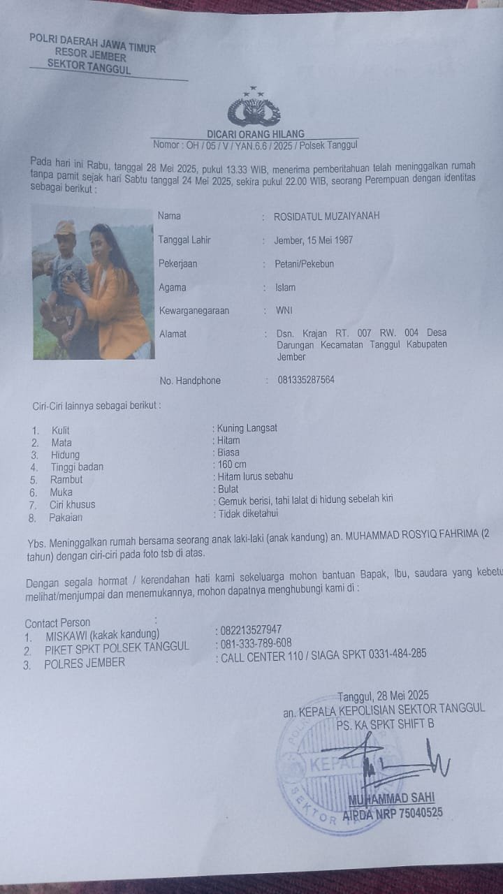 BentalaNews Jember β Duka dan kekhawatiran menyelimuti keluarga Rosdiatul Muzaiyanah (38), warga Dusun Krajan, Desa Darungan, Kecamatan Tanggul, Kabupaten Jember, Jawa Timur. Ibu dua anak itu dilaporkan hilang sejak Minggu dini hari, 24 Mei 2025, dan hingga Kamis, 29 Mei 2025, belum juga diketahui keberadaannya. Ia pergi meninggalkan rumah bersama putra bungsunya yang masih berusia dua tahun, Muhammad Rosyid Fahrima.