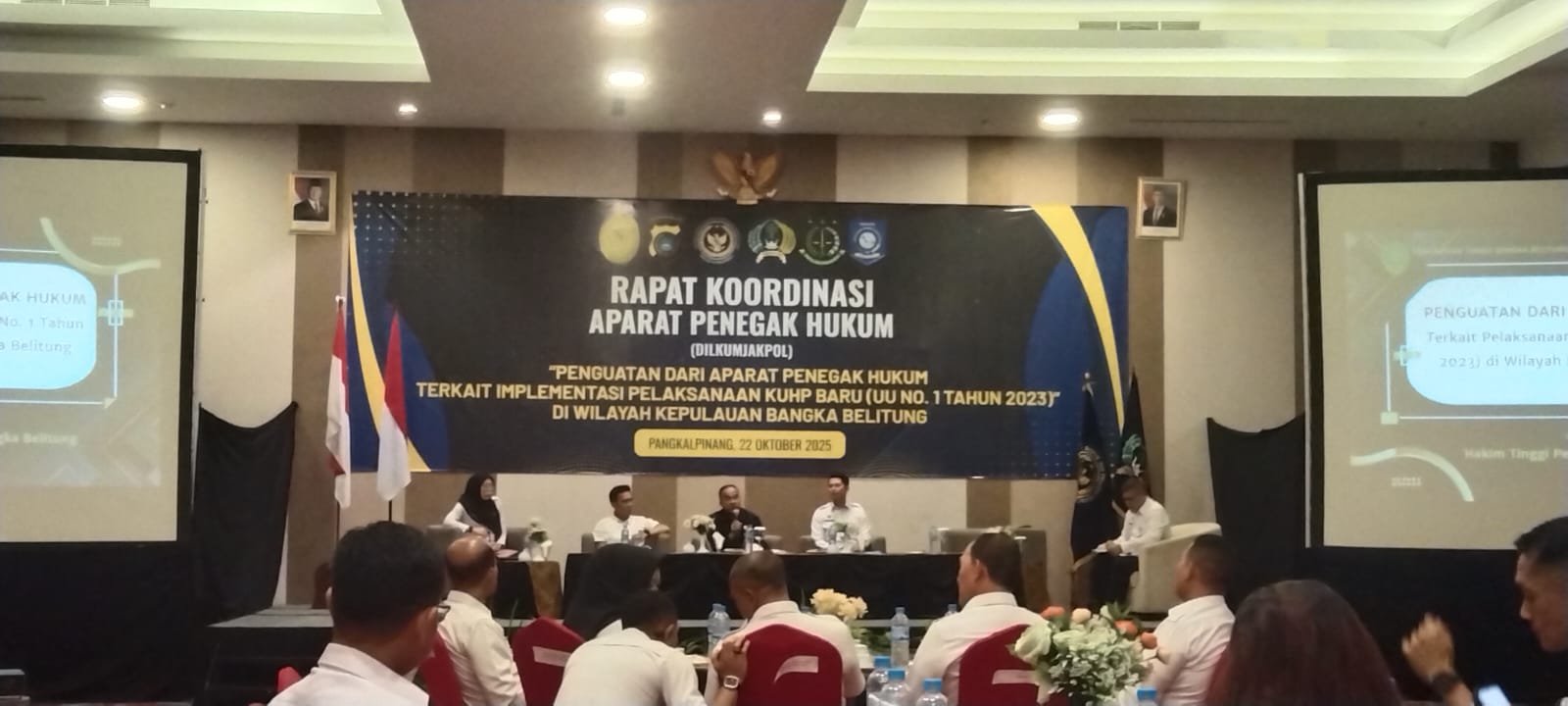 BentalaNews Sungailiat, 22/10/2025 – Kepala Lembaga Pemasyarakatan Kelas IIB Sungailiat,Bapak Dadang,didampingi Kasibinapigiatja dan staf dalam mengikuti Rapat Koordinasi Aparat Penegak Hukum (Dilkumjakpol) yang digelar di Grand safran Pangkalpinang.