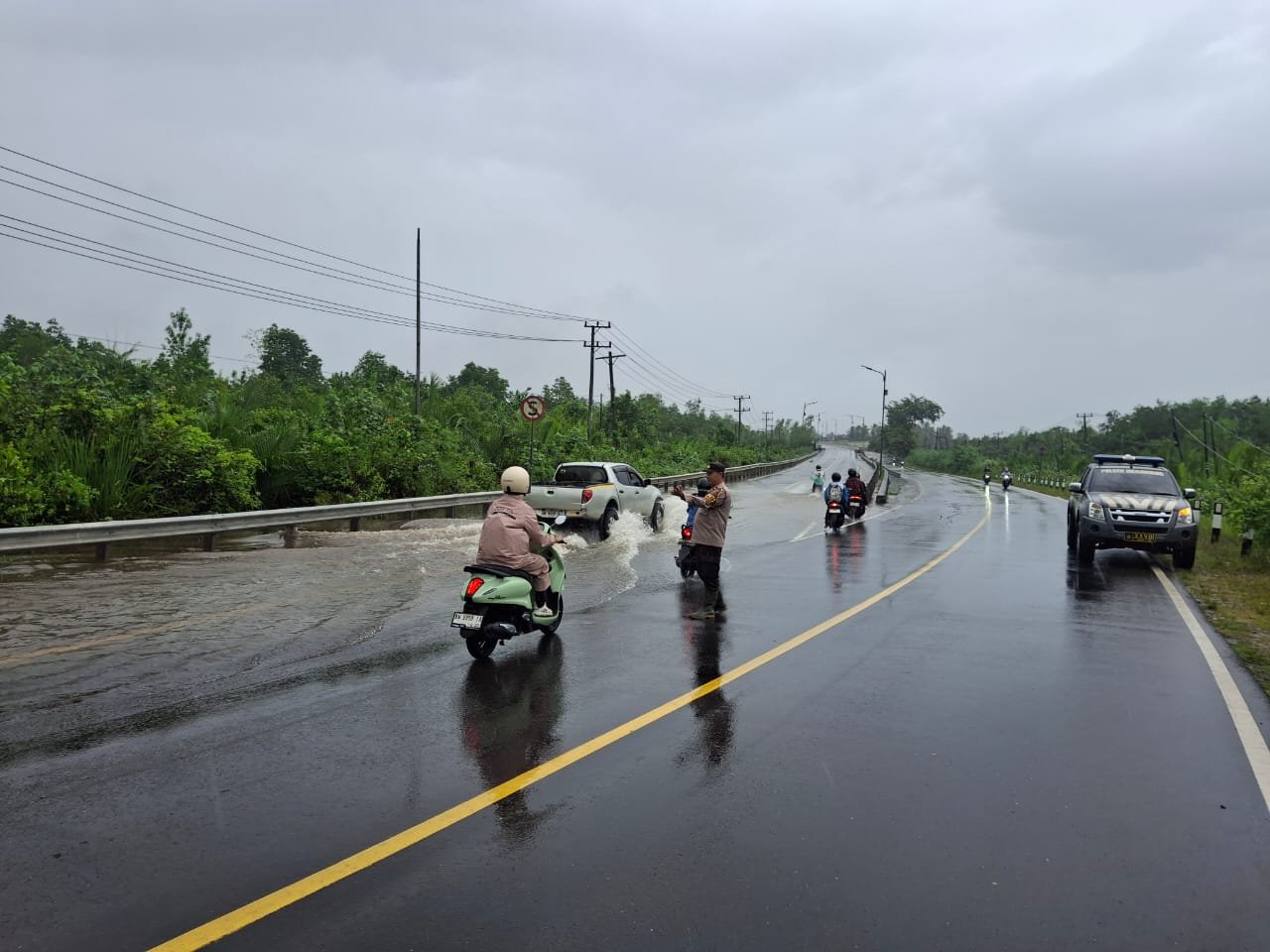 Setibanya di lokasi, personel Polres Bangka dan Polsek Merawang langsung melakukan pengaturan arus lalu lintas serta memberikan imbauan kepada para pengendara agar berhati-hati melintasi area genangan.