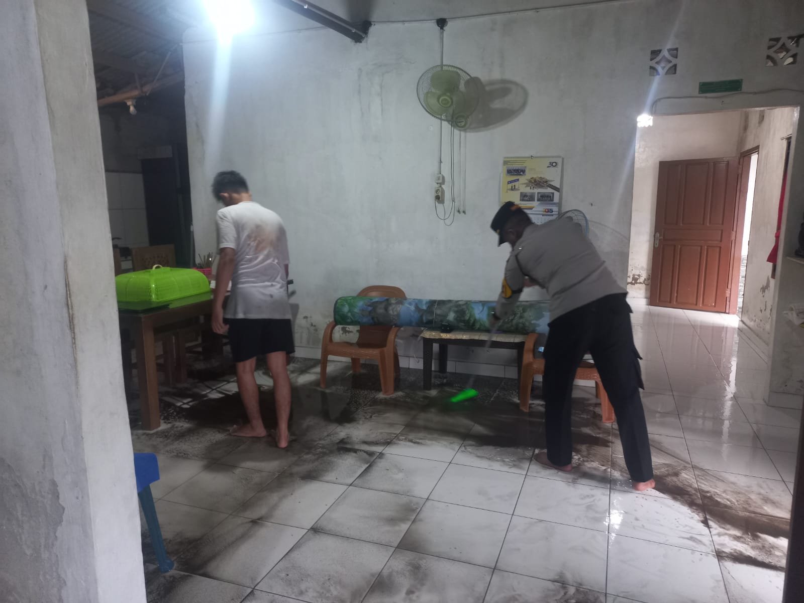 Personel Polsek Pemali dipimpin langsung oleh Kapolsek Pemali IPDA Tri Nurhadi bergabung dengan perangkat desa dan masyarakat untuk mengevakuasi perabotan, membersihkan lumpur, hingga memastikan rumah kembali layak ditempati.